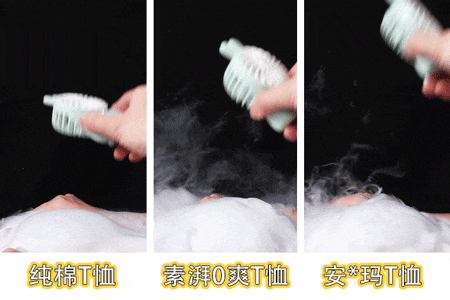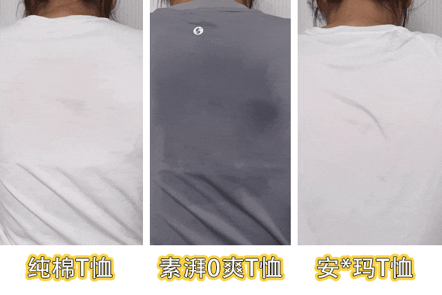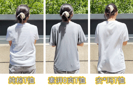 穿上素湃0爽T恤、纯棉T恤、安*玛T恤暴汗后,唯有素湃0爽T恤不粘身。