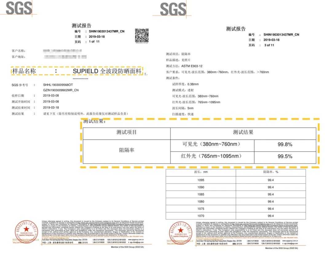 使用了专利光学面料,里面的高折光性纳米二氧化钛(TiO2),对于765nm-1095nm的红外光,阻隔率为99.5%!
