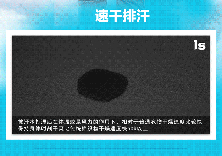 我们的单向导湿黑科技面料,短短几秒钟,便能够将水份导至外层,肌肤层如闪电般迅速干爽,时刻让体感保持舒适。