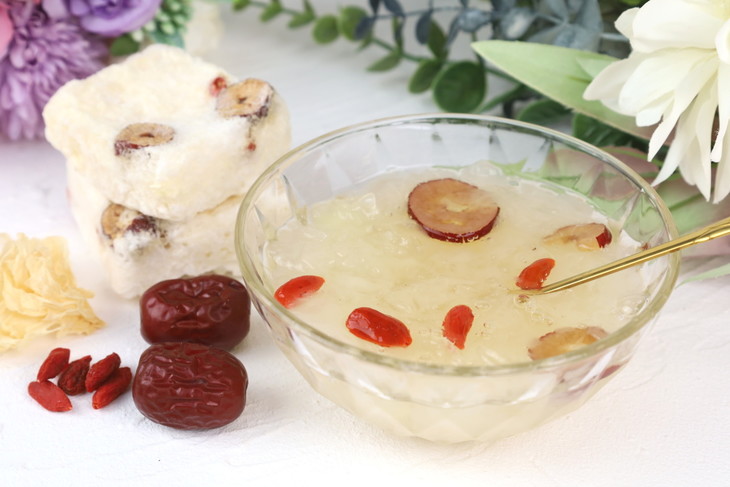 【功效】银耳补脾开胃、益气清肠,亦可滋阴润肺;雪梨生津止渴、润肺止咳;健脾养胃、益气养血;枸杞滋补肝肾、益精明目;莲子补脾益气、养心安神。