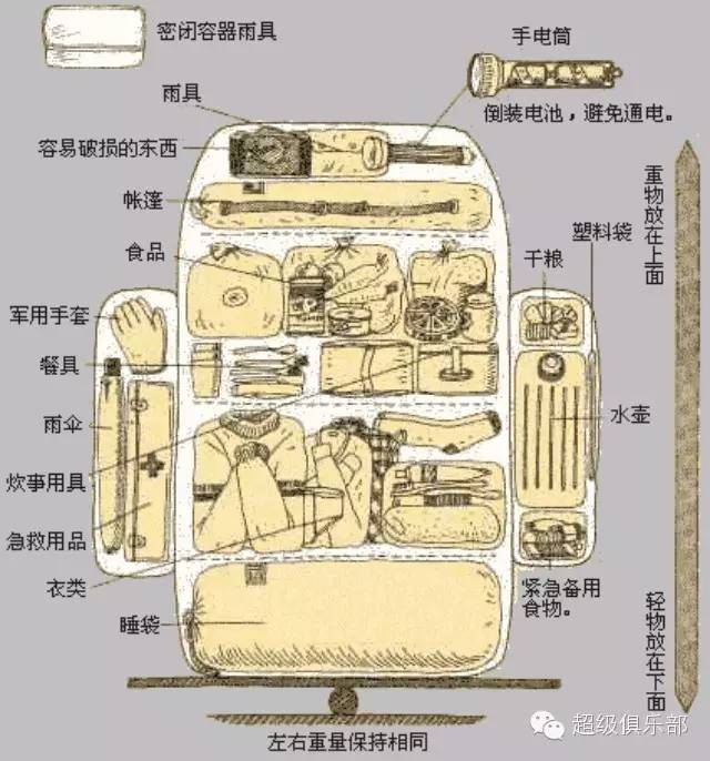 注意:重的东西应放在背包上部,并且装包时不要将睡袋、防潮垫随便放在地上,以免弄脏或让昆虫爬入。