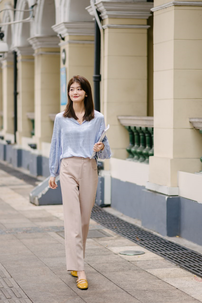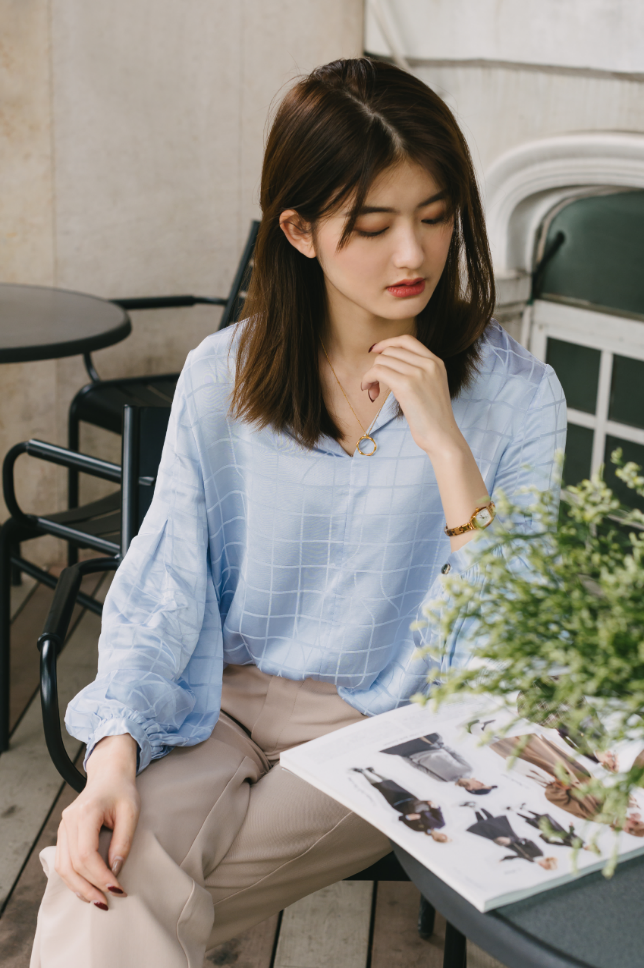 想要给单调的上班look增添一点新意思!就穿这件天空蓝丝缎质感的提花衬衫吧~丝缎面料手感顺滑,穿起来很清爽舒适,泡泡袖和领口的设计时髦又好看,天空蓝的颜色给整套look增添了清新又典雅的气质~上班穿这件很舒服自在!