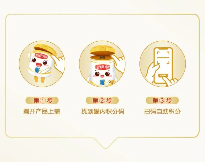 A:每一个二维码,都是一份隐形财富。打开金领冠珍护上盖找到罐内积分码,扫码即可自助积分,并用积分兑换大牌母婴好物、品质奶粉等超值好礼哦~