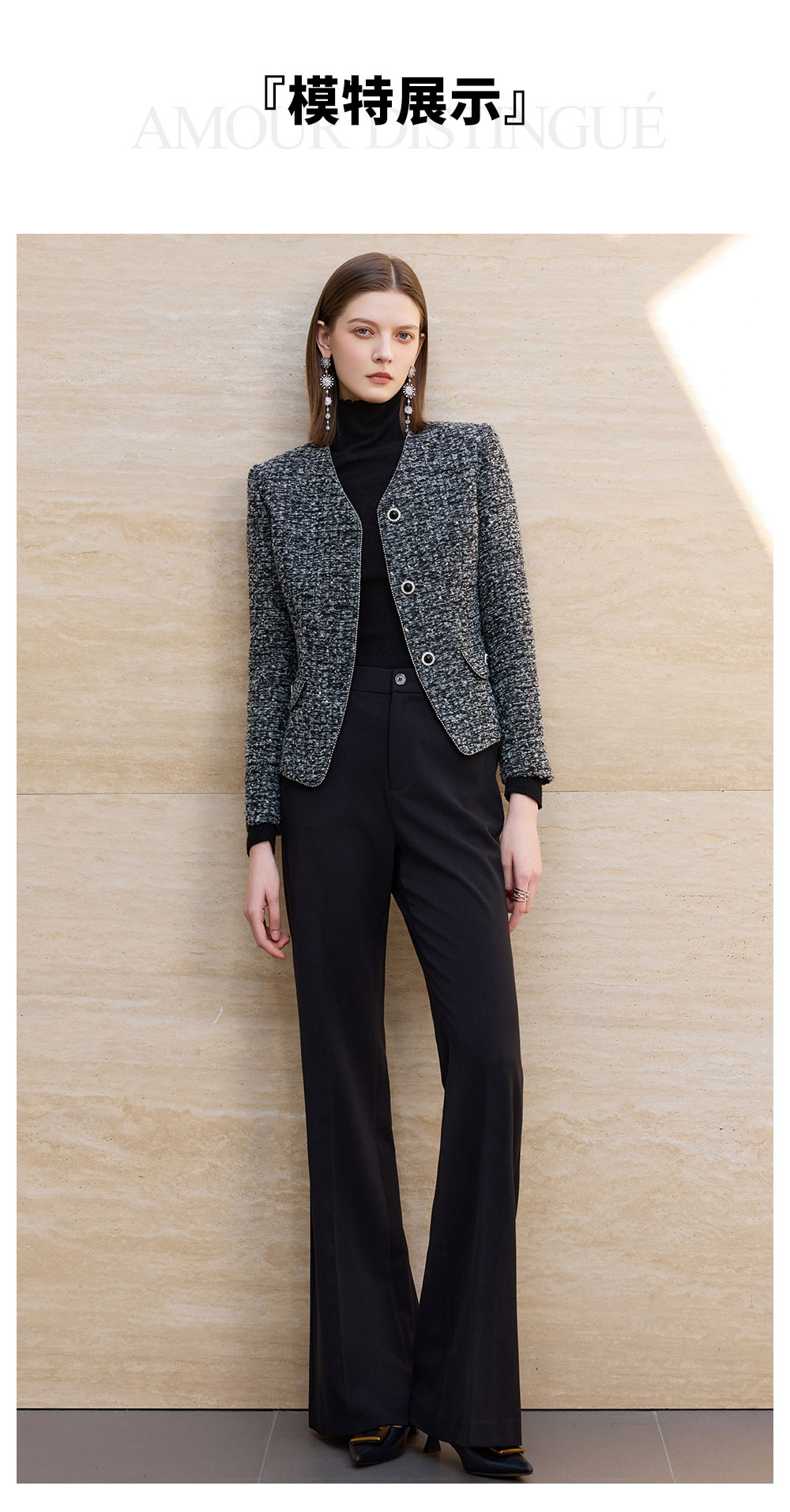 秋冬职场的 “质感顶配”,大概就是这件粗花呢西装 —— 杂色纹理像把星光揉进面料里,自带 “不费力的贵气”,单排扣 + 收腰剪裁,利落中藏着恰好的曲线。