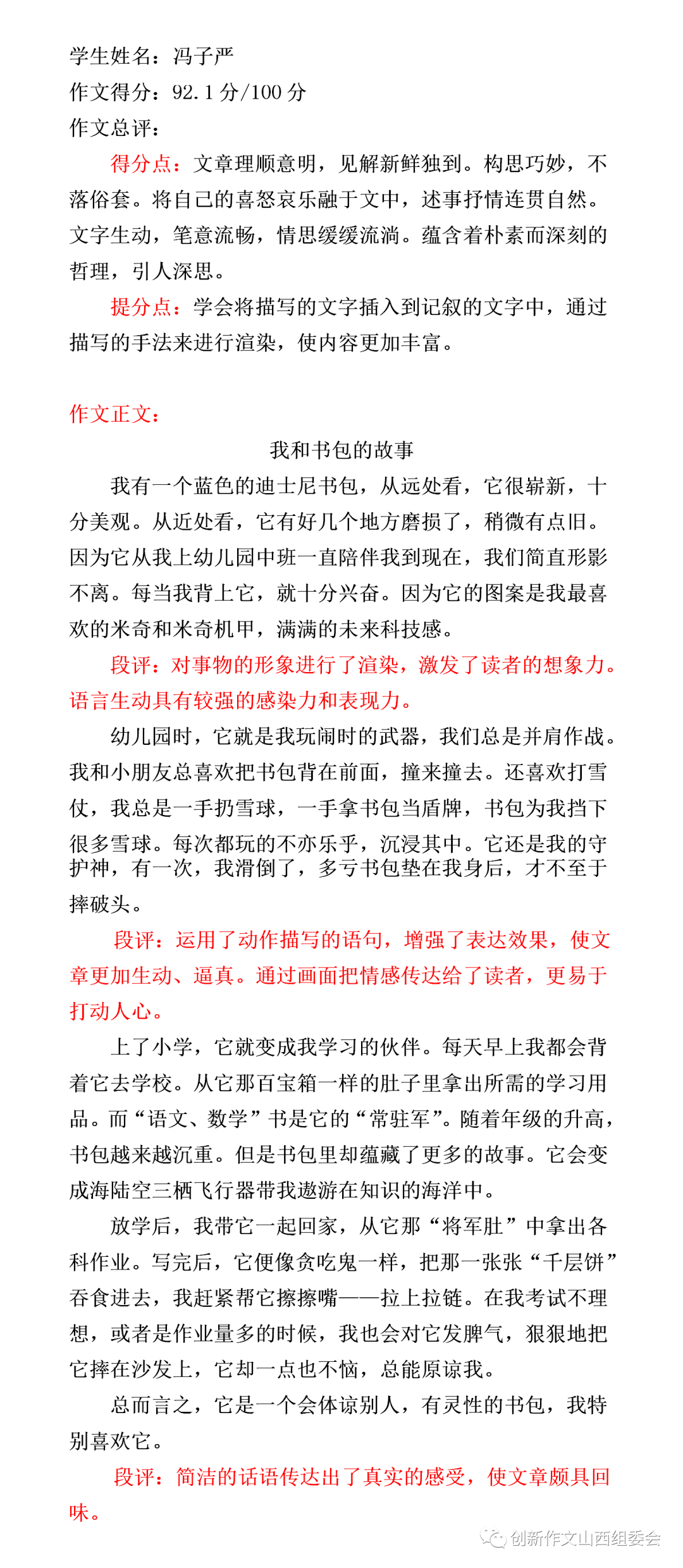 本篇文章构思巧妙,语言幽默生动。全文营造了一种幸福、温馨的氛围。把原本普通的小书包描写的绘声绘色,并将自己的喜怒哀乐融于文中。读来令人爱不释手,是篇不错的佳作。
