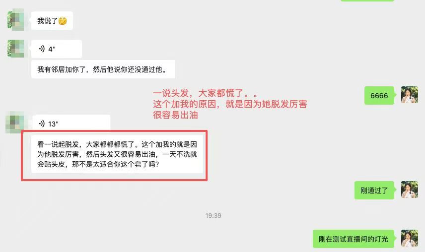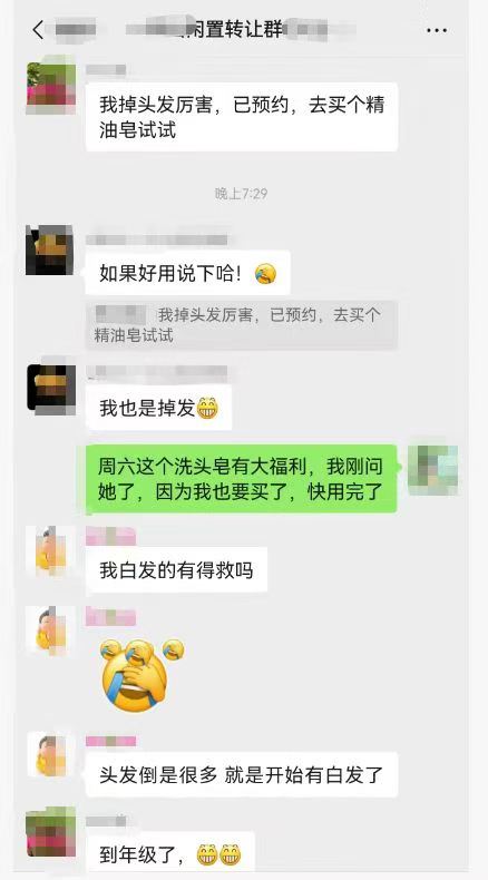 “我掉头发厉害,已经预约,去买个精油皂试试”“我也是掉发😭”“头发倒是很多,就是开始有白发了,到年级了😅”“一说头发,大家都慌了。这个加我的原因,就是因为他脱发厉害,头发又很容易出油,一天不洗就贴头皮,那不是太适合你这个皂了吗?”
