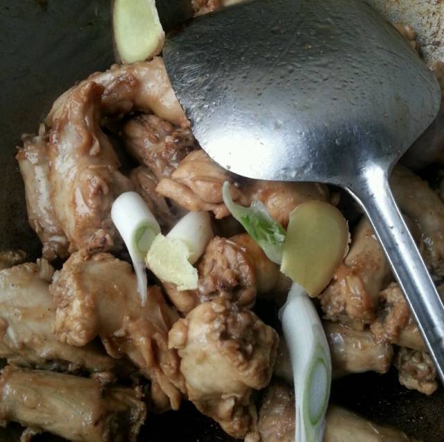1、热锅凉油,油放1两左右,把鸡脖子放进去翻炒两下,看肉缩紧了,加入葱段,姜片,大蒜瓣,煸炒出香味;