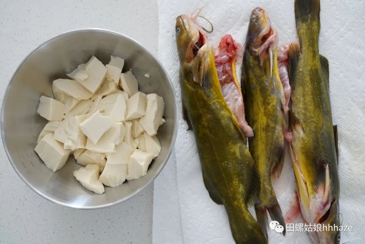 1.将食材进行简单处理,剖好的黄辣丁清洗干净之后,用厨房纸巾尽可能擦干水分,豆腐掰成均匀的大小(别太小)备用