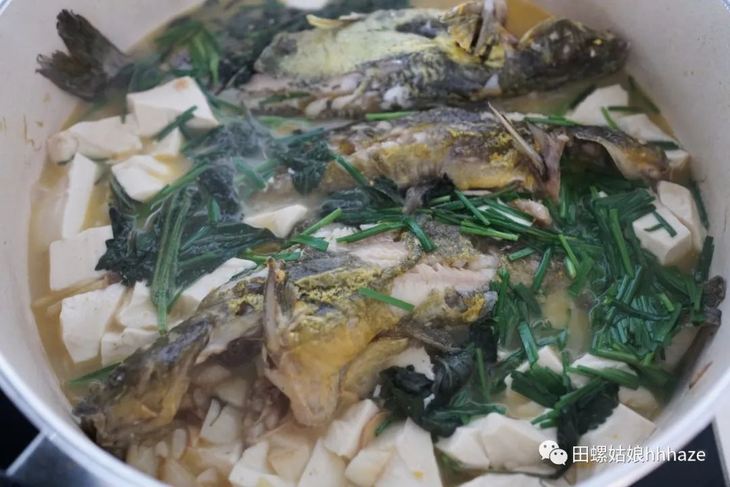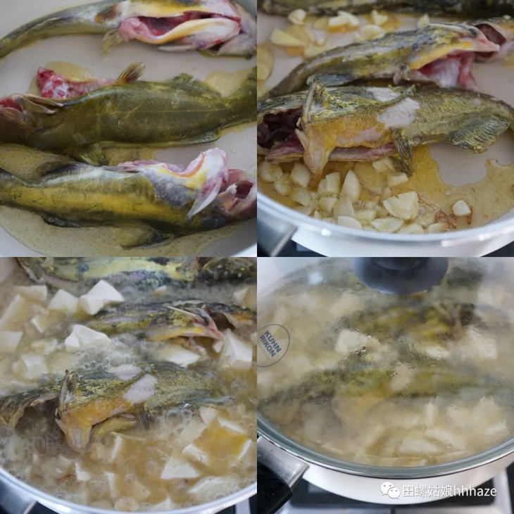 4.转大火,加入没过鱼身3/4位置的沸水和豆腐块,加盐,盖上锅盖保持大火煮上5分钟