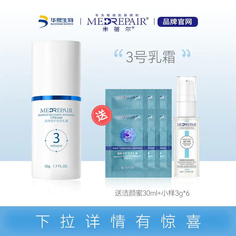 华熙生物集团旗下——米蓓尔MEDREPAIR,源自华熙生物多年潜心研发,“精于修复,专注美丽”为消费者解开敏肌密码,4D-HA四重活水创专利配方取代市场主成分,提供解决敏肌问题的方案。