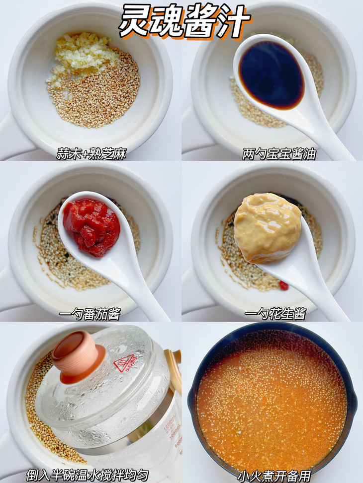 ❸调一个灵魂酱汁:蒜末+熟白芝麻+两勺宝宝酱油+一勺番茄酱+一勺花生酱,倒入半碗温水搅拌均匀,小火煮开备用