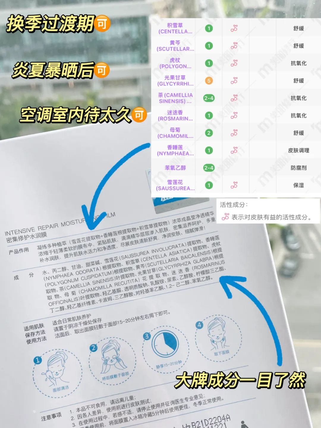✅去黄:光果甘草、茶多酚、虎杖提取物光果甘草、香睡莲和雪莲花的加持,有这3大成分在,皮肤再也不怕闹情绪!我对这种高频使用的补水面膜还有一个要求:配方够干净,皮肤负担小。思美润这款不含香精、酒精等风险成分,敏感肌、孕产妇可用!官方都直接把这款面膜定义为是干敏肌的救星,秋冬的所有干燥都能用它抚平。亲肤又轻薄,贴起来宛如肌肤的第二层,特别服帖~鼻翼边边角角都贴合了。膜布抓液力很强,摊开精华液也不会滴得到处都是,这样就可以安心躺沙发上玩手机啦~白天晒后,贴一片上去刺啦降温;熬夜暗沉,贴一片填充毛孔;日常亮肤补水,贴一片密集输出。很多补水型面膜为了降成本会加一些硅类作为润肤剂,乍看精华厚重,洗脸的时候滑溜溜的,简直洗不干净。思美润不搞这些虚的,不添加硅类成分,实打实的保湿有效成分!最近朋友都追着问我用啥护肤品,其实我只是敷对了面膜而已!如果你最近也被干燥、泛红、换季敏感、熬夜脸垮这些皮肤问题所困扰,不妨给自己补补水叭~