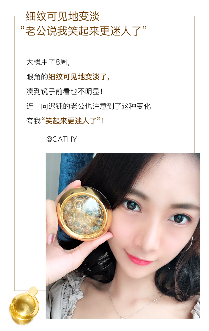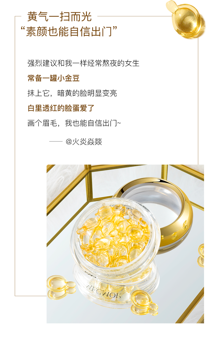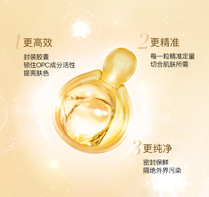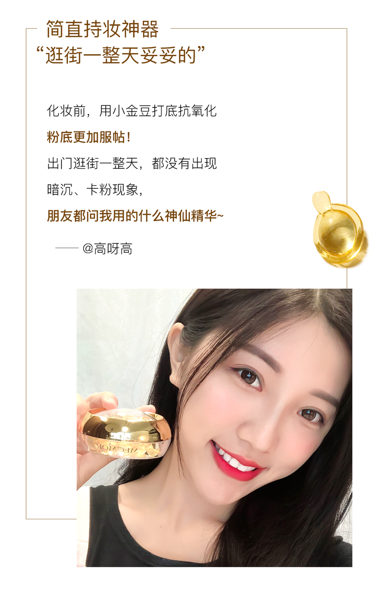 熠熠金光、造型如珍珠般的高颜值胶囊包装,既能100%隔绝外界污染、又能切合护肤所需,每次一粒,为护肤倾注满满的仪式感~