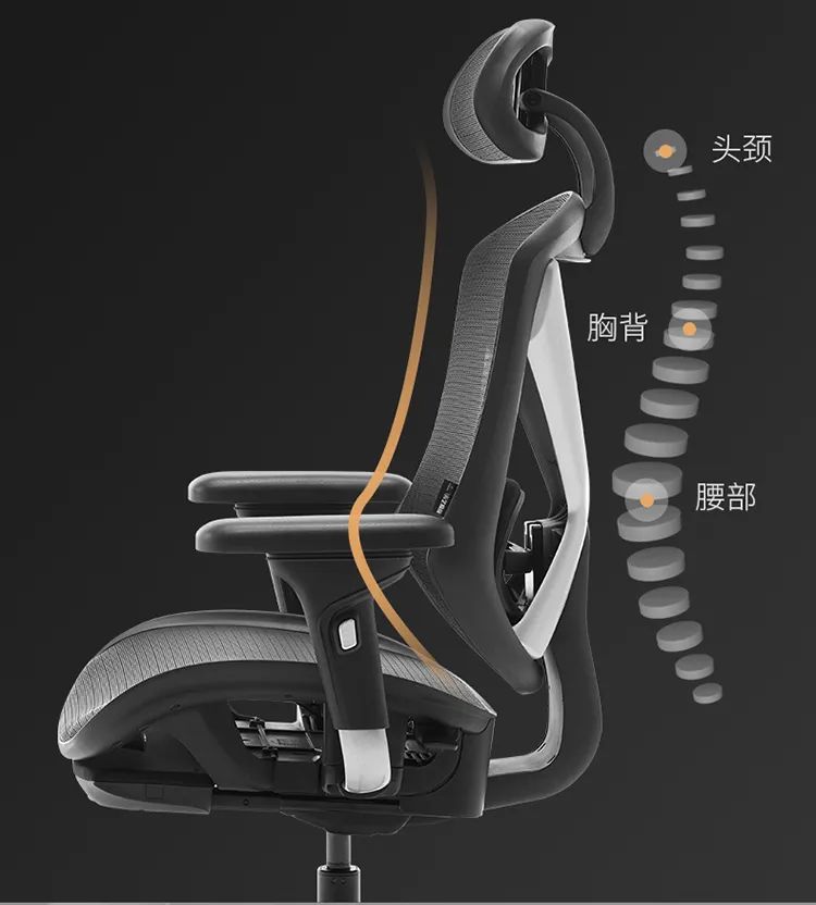 这款椅子采用流线型仿生脊椎曲线椅背设计+线控自适应底盘。
