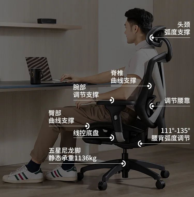 它不光可以减少腰部的损伤,还可以对肩颈、臀部、手肘等地方支撑调节,让你久坐不累。