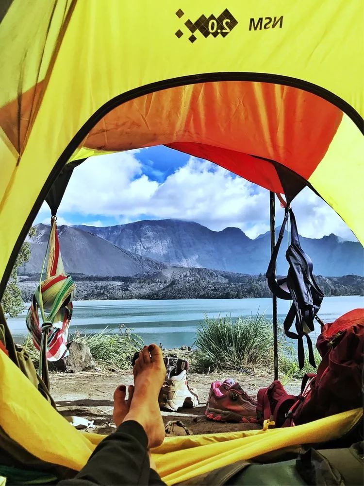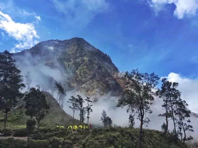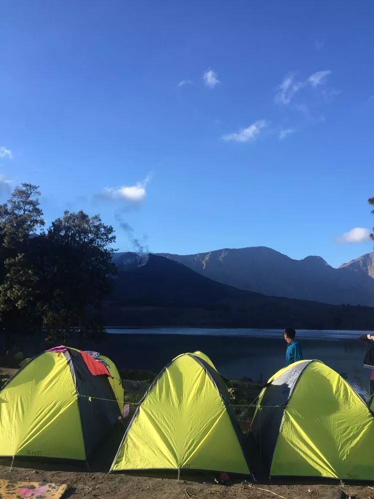 把营地扎在湖边,前面是冒烟的火山湖,背面是山!