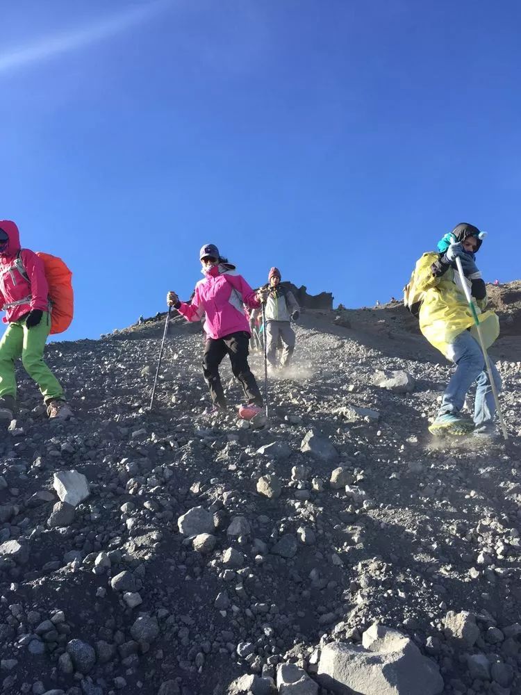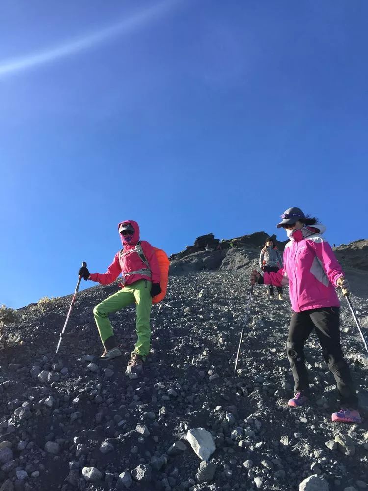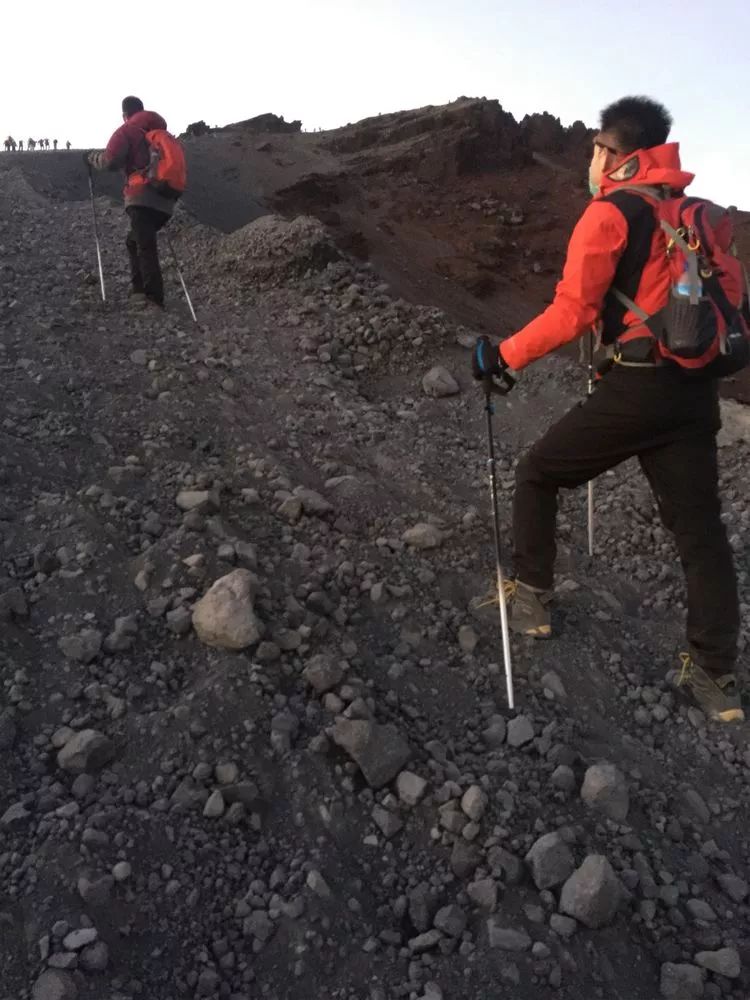 全是火山灰和碎石,走一步滑半步,事倍功半,下脚都难,全靠登山杖了!