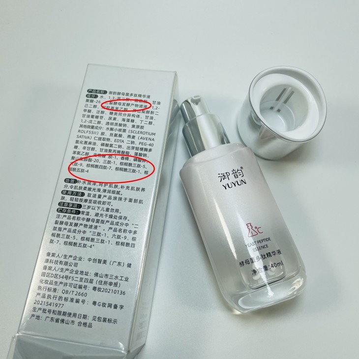 实力决定品质,然后我们回到产品本身,今天先是单说这个精华液,酵母菌多肽精华液,单从字面意义理解,里面就是包含了酵母菌和多肽两种优秀的修护和抗老成分,重点成分已经画出来了。