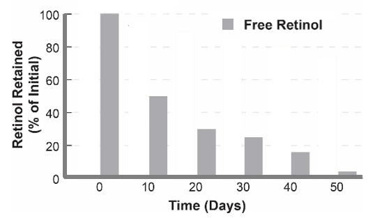 视黄醇是出了名的大明星脾气,非常不好相处。遇到不喜欢的氧气、光、热、重金属啥的,立马装死(失活)给你看。所以才会导致,明明配方里加了挺高的量,最后测下来可能所剩无几。从SALVONA的一项实验中可以发现,含有视黄醇的乳液放置在42°C条件下50天后,视黄醇的活性就只有初始配方的5%了~