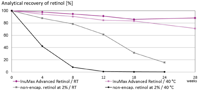 其中一款包裹技术的视黄醇原料推测应该是来自于德国赢创的Inumax,原料含有约为8%的视黄醇,从他们做的稳定性数据上来看,原料在室温条件下放置28周仍然可以保留90%左右的视黄醇活性,说明这个包裹技术还是比较稳定的。