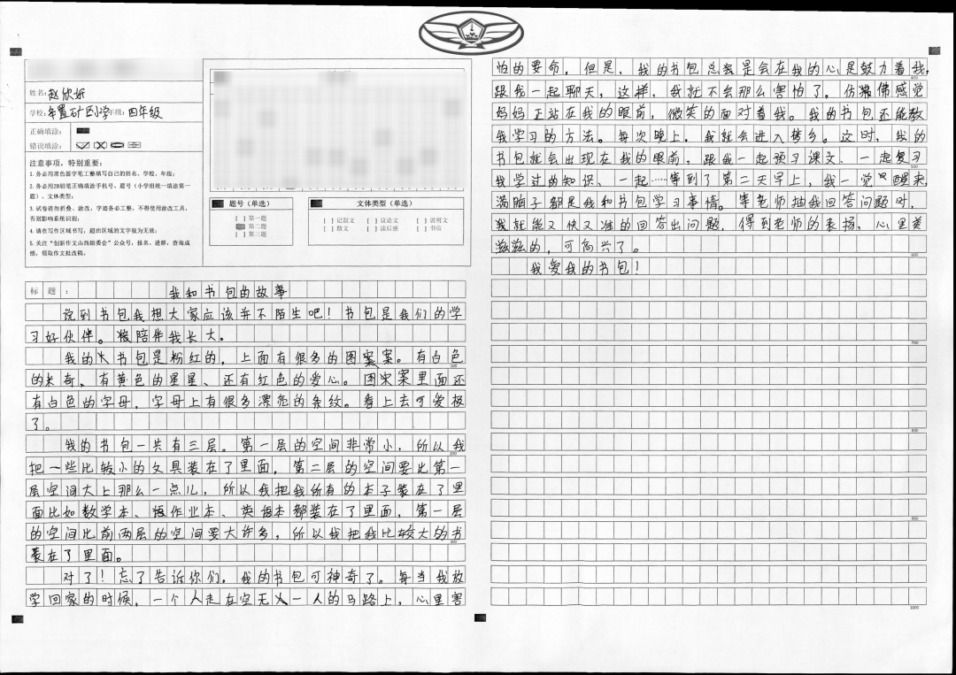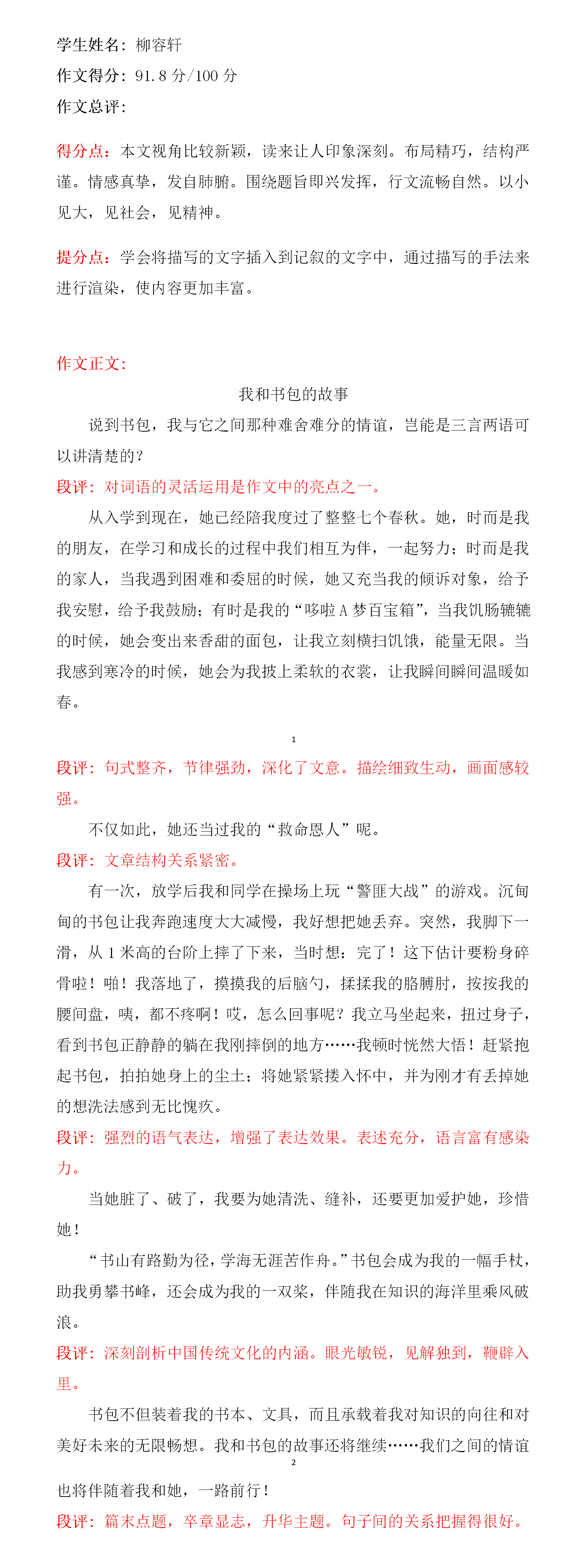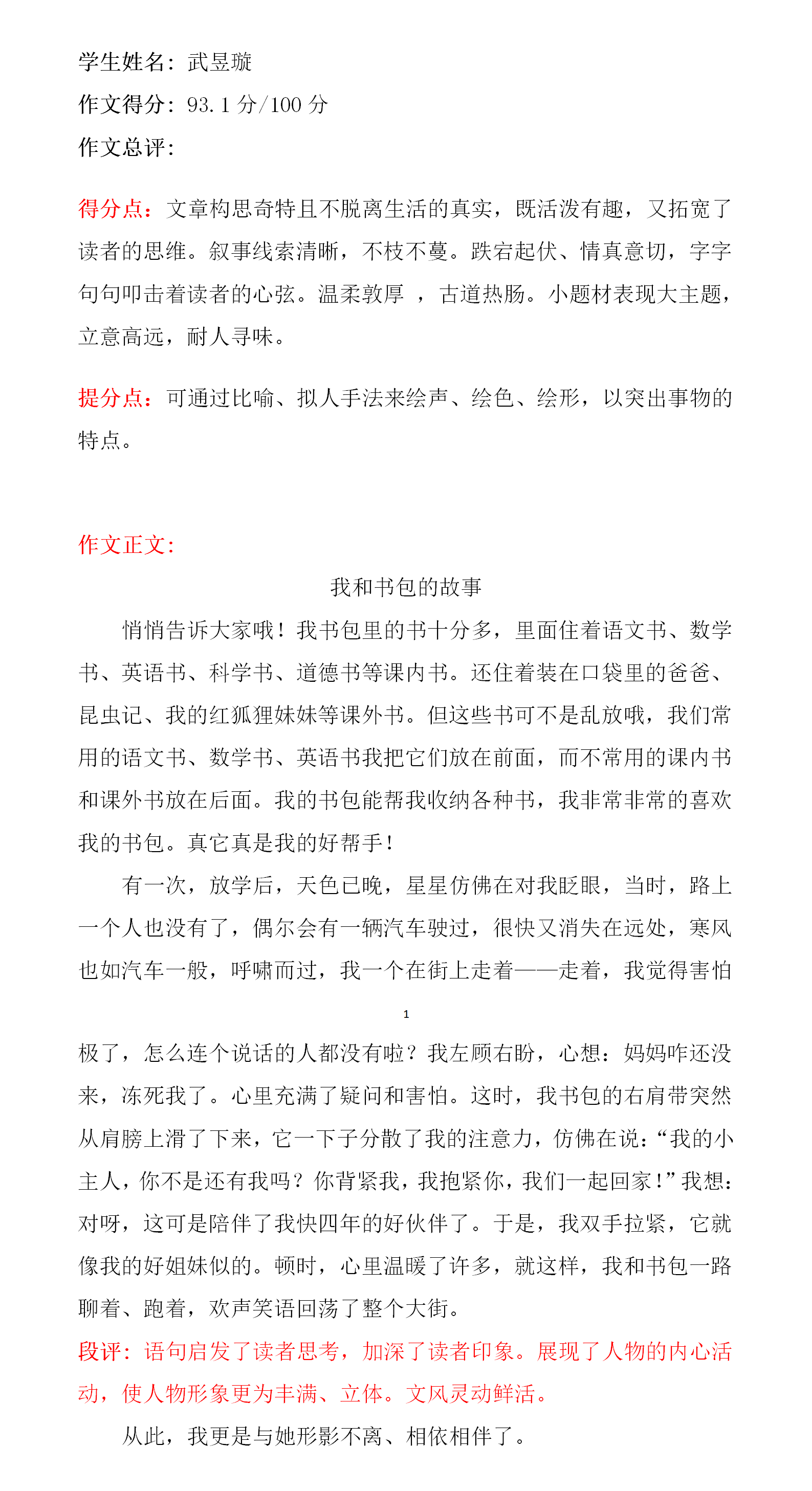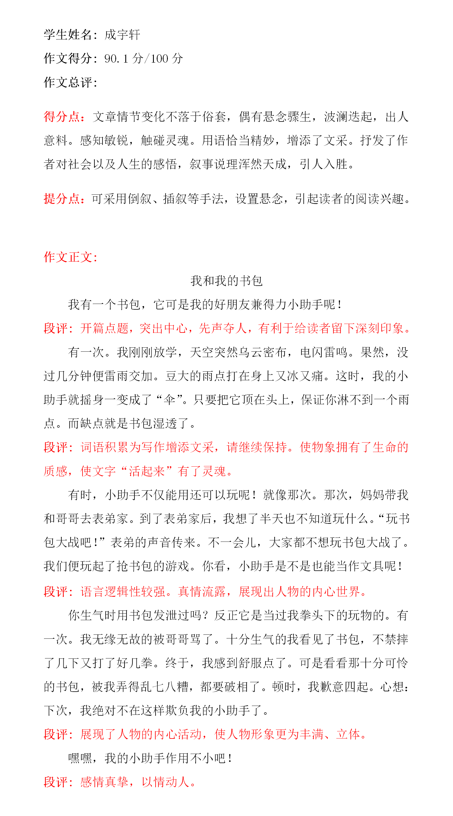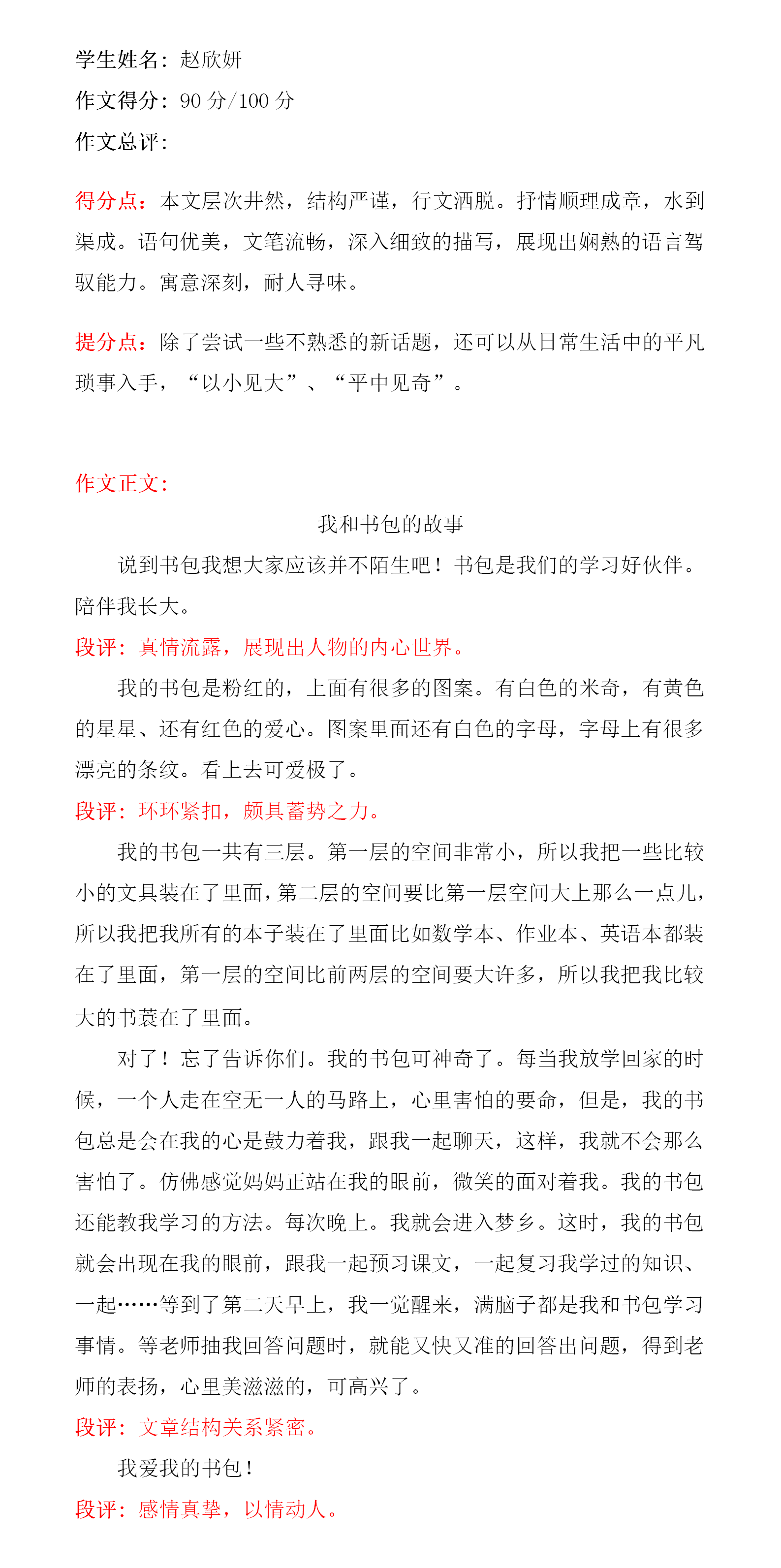 文章语言生动活泼,构思独特合理,符合儿童心理,从字里行间能让我们感受到她对书包的喜爱之情。你很擅长写作,文学功底也好,老师在这里希望你在未来的学习中,用心感受和品味生活,写出更加感人的好文章。