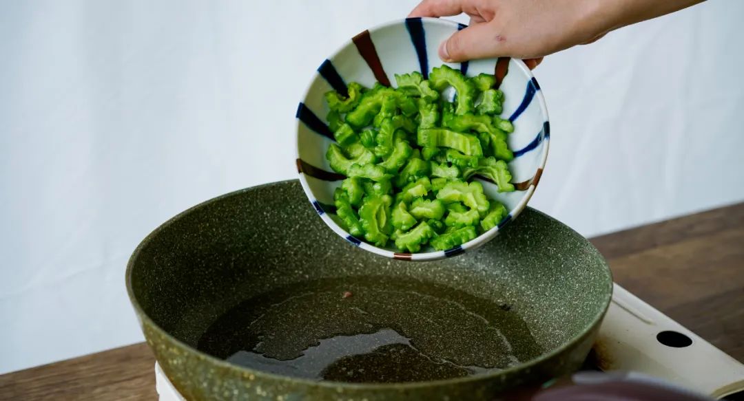 4.炒苦瓜:继续用锅中的余油,如果不够了再加点,油热后倒入苦瓜中火翻炒一分钟。
