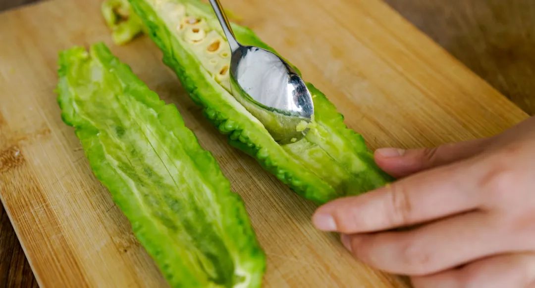 1.处理食材:苦瓜洗干净后对半切开,挖掉籽和白色的瓤。