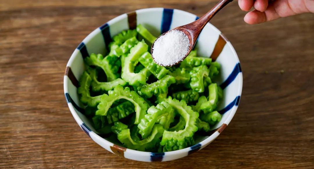 切片,加入1小勺的盐,腌渍一会后冲洗掉一遍,去除苦味。