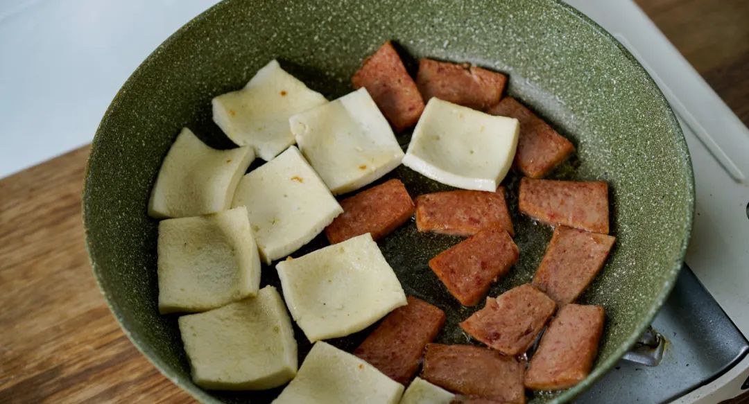 3.煎豆腐:开火,用炒蛋剩余的油把豆腐和午餐肉煎一下,表面略带金黄即可盛出。