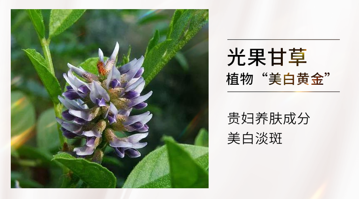在美容业界,光果甘草一直有“美白黄金”的说法:一克光果甘草的提取成本和一克黄金等价,美白淡斑效果是普通维C的近百倍,熊果苷的232倍!