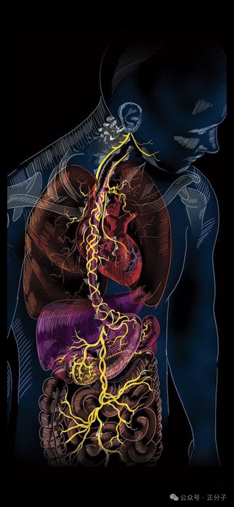 上面绘图中黄色线条即为自主神经系统中最为重要的迷走神经。这条神经穿越和连接了几乎所有的重要脏器,因其弯曲复杂的路径而得名“迷走(Vagus)”。迷走神经代表的自主神经系统,控制着所有重要脏器的生理活动: