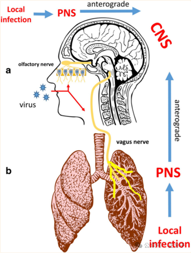 当某些嗜神经病毒,比如新冠,疱疹病毒等入侵人体时,它们会沿着两条路径顺行(anterograde)入侵脑神经系统,一条是鼻腔的嗅神经,一条是肺部的迷走神经。【1】