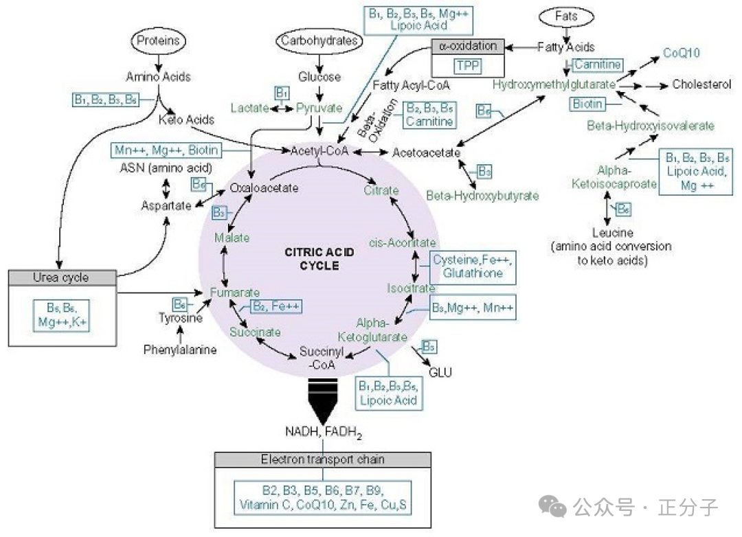 我们吃下去的食物,无论蛋白质、脂肪或者碳水化合物,都通过一系列的化学反应生成乙酰辅酶A,经由三羧酸循环生成NADH/NAD+,再经由线粒体膜上的电子传递链,将ADP转化为ATP。这系列的复杂反应中,B族维生素起到了至关重要的催化剂作用。而其中,维生素B1(硫胺素)则处于中心位置。打个比方来说,营养物质好比汽油,细胞好比发动机,那么硫胺素就相当于火花塞。如果没有火花塞(硫胺素)的点火(催化),你吃再多食物、呼吸氧气也没有用,不能氧合转化成能量。没有能量,人体的一切生理活动都无从谈起。