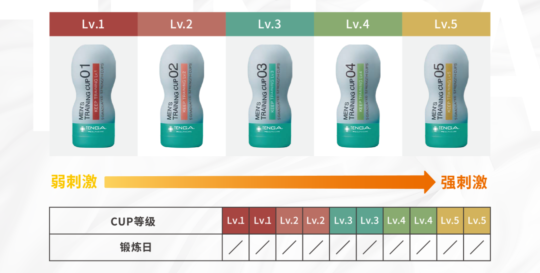 TENGA早泄训练杯分为5个等级,从Lv.1到Lv.5,刺激程度也由弱到强。