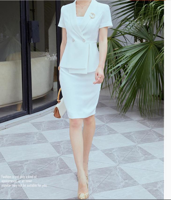 职场穿搭总是希望温柔且干练,白色西装恰是最好演绎多种穿搭的经典之一。套裙总是优雅的代表之一,包裙和上衣不规则的设计比传统的套装更显别致和时尚。
