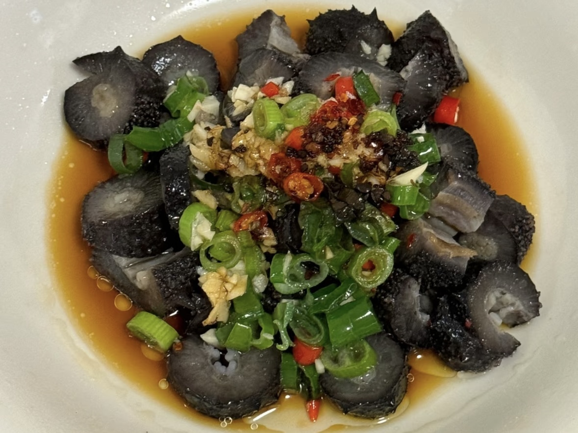 4、海参泡发处理后切片,放在蛋羹上继续蒸3~5分钟;