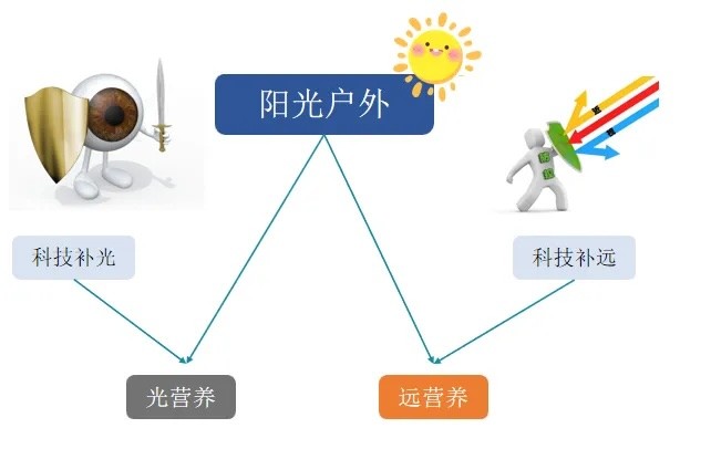 阳光户外是近视防控的首选方案,可以给孩子提供充足的光营养和远营养,帮助脉络膜恢复厚度,增厚盾牌,抵抗大量的近距离用眼造成的近视刺激。