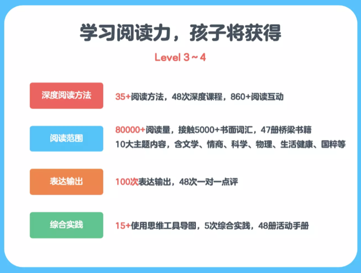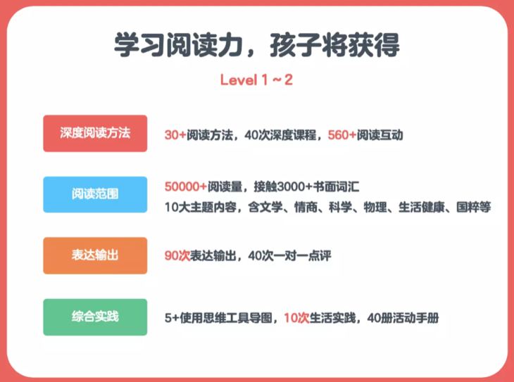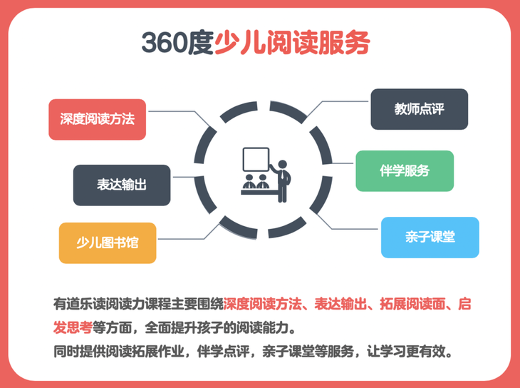 有道乐读阅读力课程主要是围绕深度阅读方法、表达输出、拓展阅读面、启发思考等方面,全面提升孩子的阅读能力。
