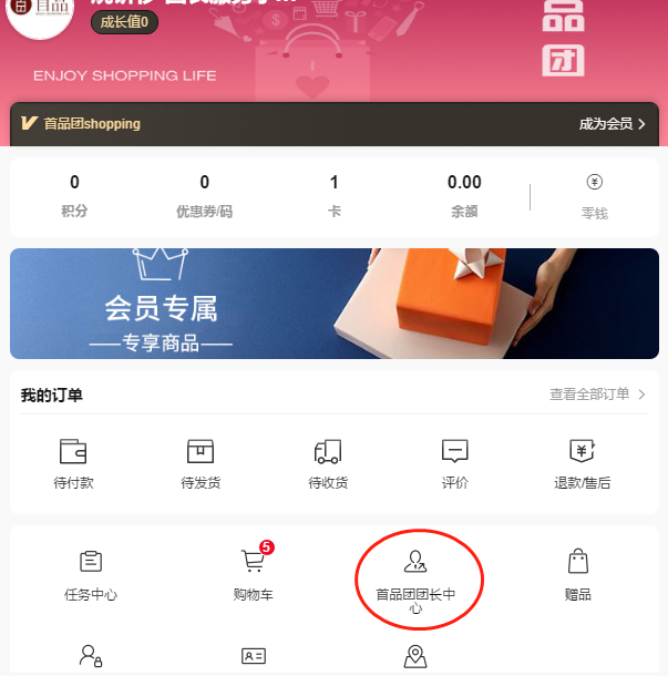 在个人中心页面,大家可以看到“首品团团长中心”的标志,这个只有咱们团长才可以看到的。点击进入团长中心