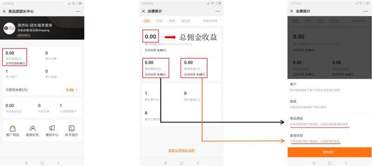 大家可以通过团长中心,查询自己的收益明细,用户明细,订单明细等所有的交易信息。以及通过点击可提现金额,来将我们的佣金收益提现。
