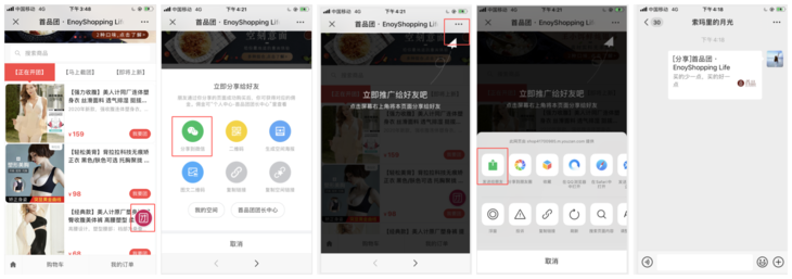 总结一下就是,分享某个产品需要点进商品详情页,分享整个店铺直接从店铺主页就可以的