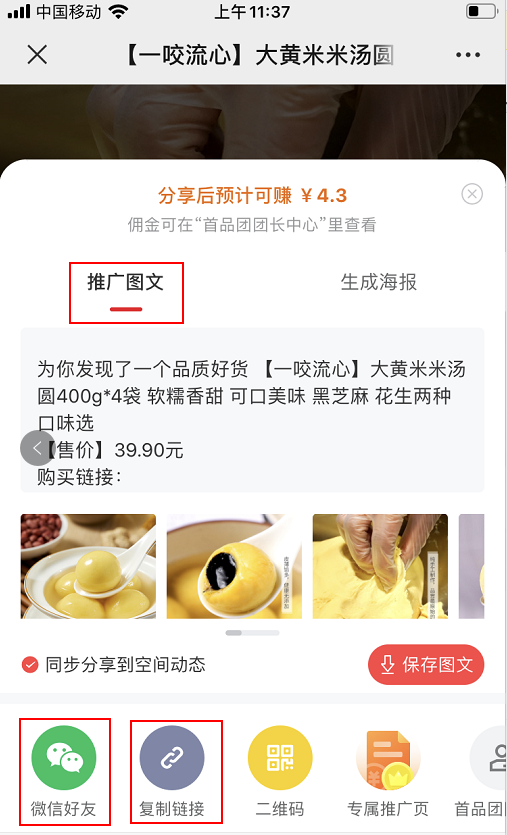 我们点击团字图标—推广图文—微信好友(或者复制链接),就可以把你的专属图文链接分享到群里或者分享给好友啦