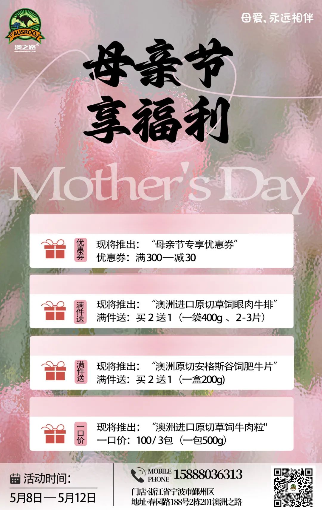 On this special day, may the sunshine of Mother's Day fill your heart, bringing endless satisfaction and joy to your taste buds through the freshness of Australian imported beef. Mom, you've worked hard! May you always be healthy and happy!
