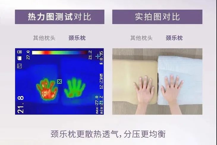 用热感仪拍摄能明显看出,颈乐枕散热更快,透气性能更好,夏天不至于闷汗。
