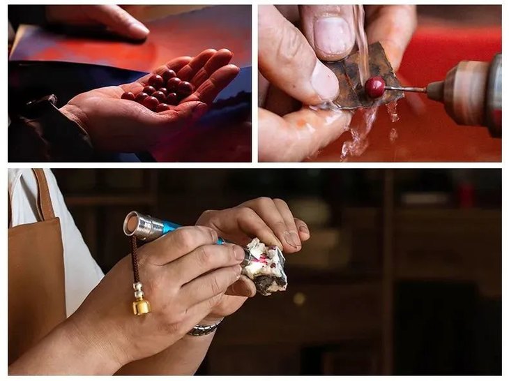 不惜成本,都是经由几十年老工匠师傅精细抛光,每一粒朱砂用砂纸手工一遍遍重复打磨,直到产品呈现出天然的油亮光泽。
