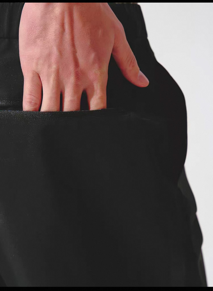 轻薄透气可少许拉伸,正面纯色,后背单侧屁股口袋格纹贴布装饰点睛