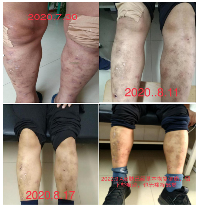 从下面所拍摄的图片可看出,郭先生腿部皮肤随着调理的推进呈现出逐渐好转的态势,2020年9月4日 皮肤已经基本恢复健康,开始结痂复原,瘙痒感消失。