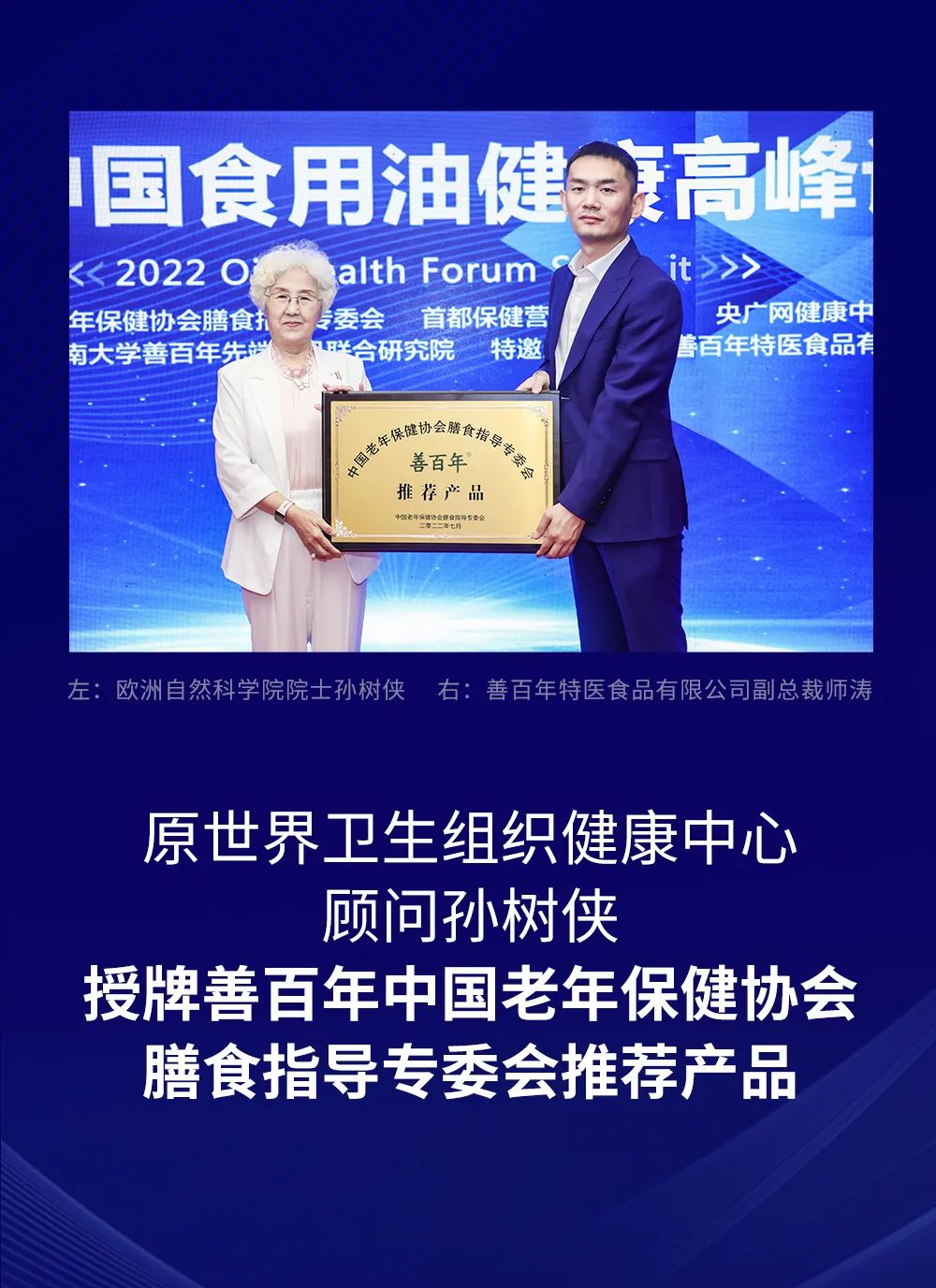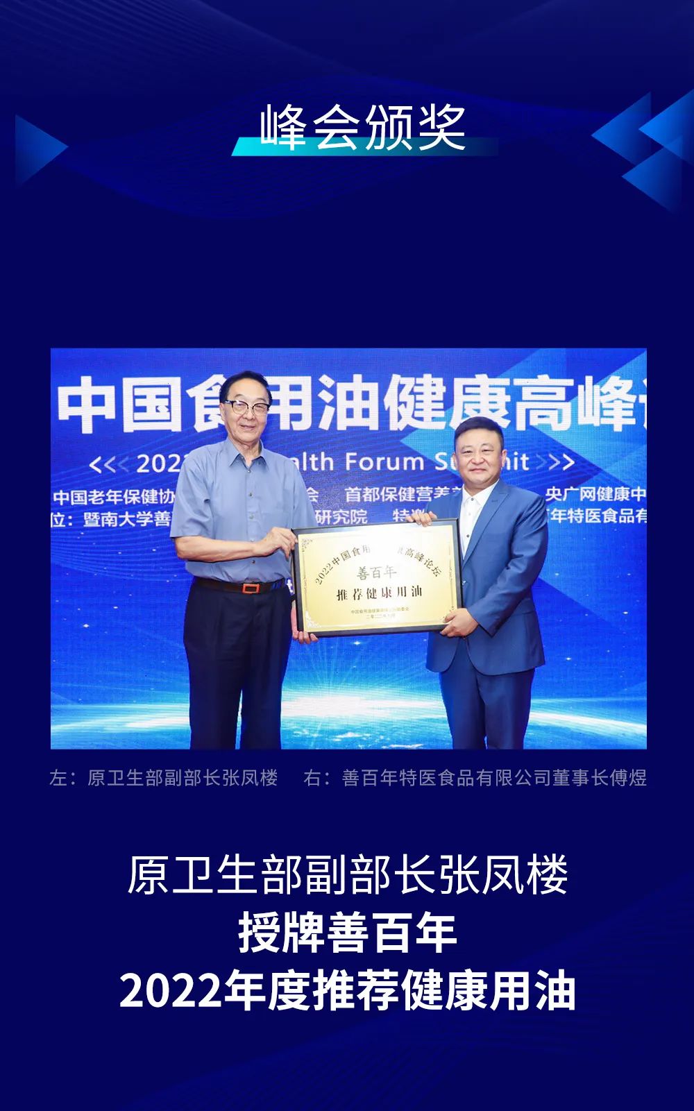 人民网报道:善百年荣获2022年度推荐健康用油,原卫生部副部长张凤楼现场颁奖