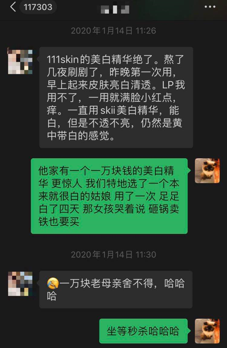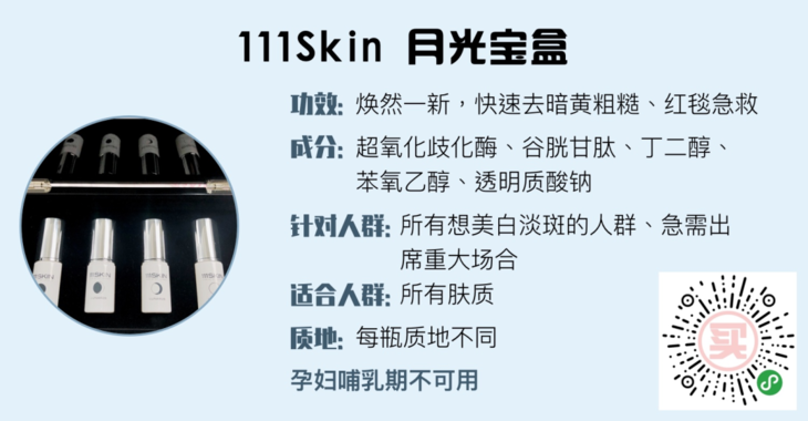 3、如果你追求丝滑完美体验,质地水感,那就111skin,水润感,秒吸收,祛黄,脸色会白亮,但贵妇牌肯定不便宜,只是同类成分和体验,相当于1万快月光宝盒的平替
