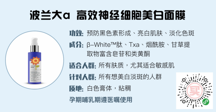 除了抑制黑色素生成,面膜的成分中还有减少炎症的因子,能有效的舒缓红肿,所以为什么说敏感肌超级适用,就是因为这点,也特别适合用在刷酸啊 IPL光子嫩肤和激光治疗之后维持美白效果。